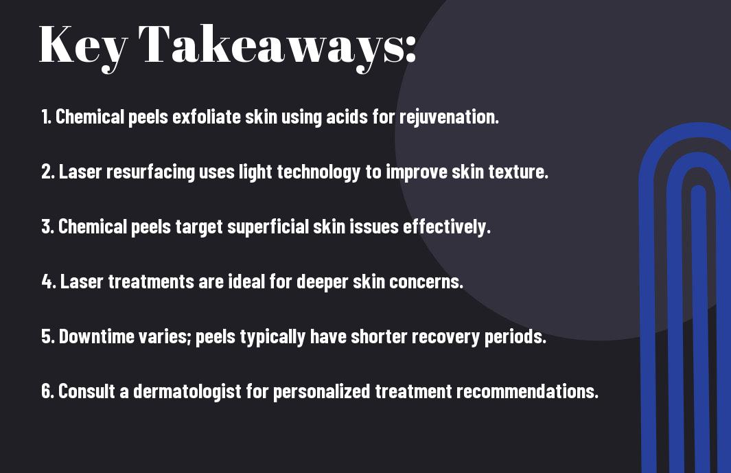 On the whole, choosing between chemical peels and laser resurfacing depends on your specific skin concerns and goals. Chemical peels effectively target superficial skin issues like fine lines and pigmentation, while laser resurfacing tackles deeper skin problems and improves overall texture. Understanding the unique benefits and potential side effects of each option is key to making an informed decision. Consult with a qualified dermatologist to assess your skin type and discuss which treatment will best suit your needs, ensuring you achieve the desired results for your skincare journey.
